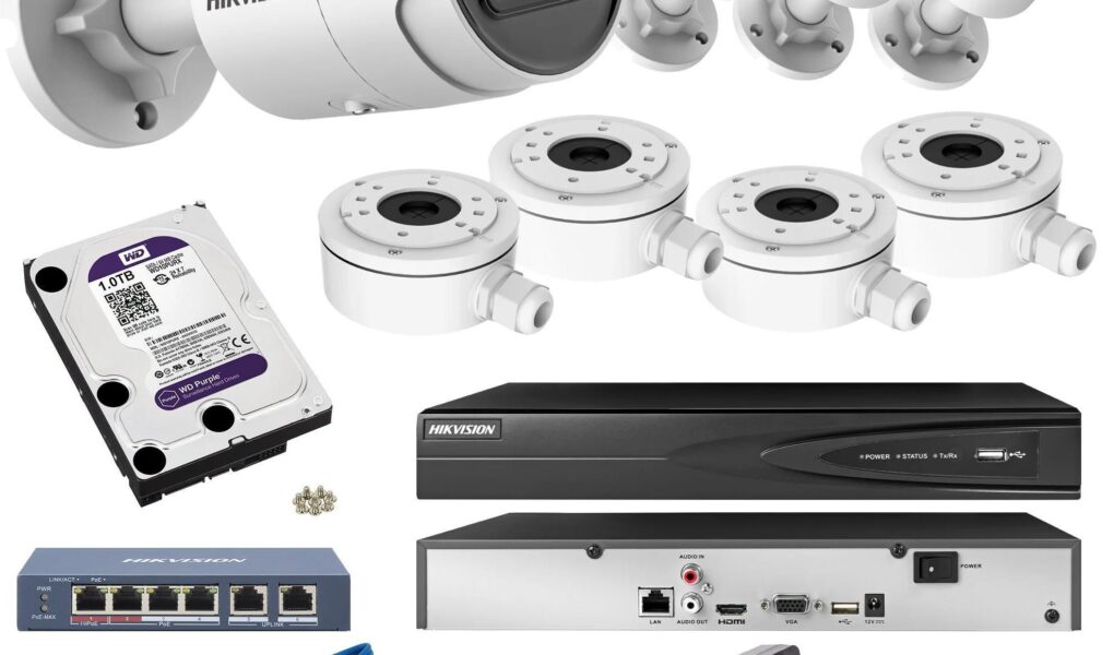 4x Kamera Hikvision DS-2CD2043G2- I (2.8mm) + 4x Uchwyt + Switch + Rejestrator + Dysk 1TB