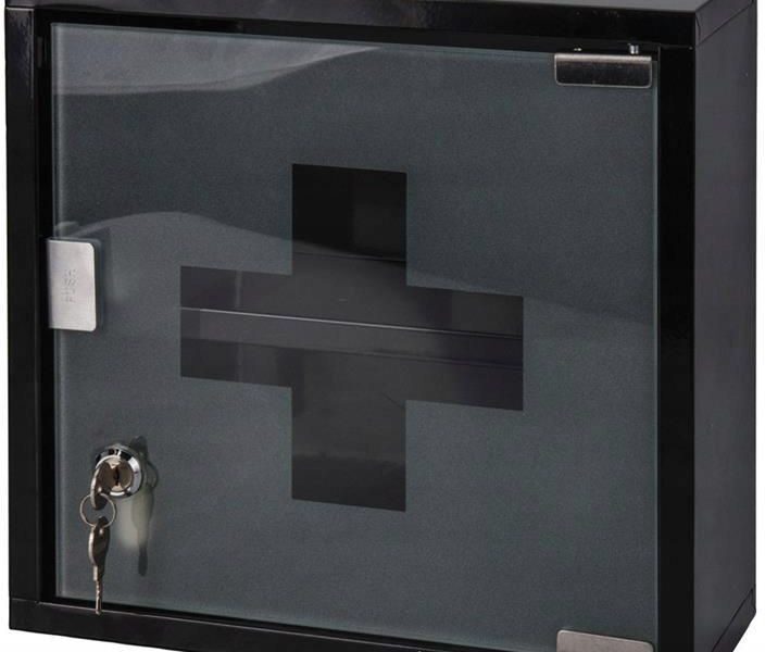 Szafka ścienna w formie apteczki w kolorze czarnym. Niezbędna w każdym domowym wnętrzu. Idealnie pasuje do łazienki, czy kuchni.Całość wykonana z metalu, szyba szklana matowa.Do apteczki dołączone są 2 kluczyki.Grubość szyby : 3 mm
