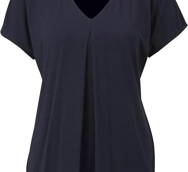 W Heine Koszulka w kolorze granatowym zastosowano dekolt w kształcie V, który optycznie wydłuża sylwetkę i delikatnie podkreśla linię obojczyków. To rozwiązanie często wybierane przez osoby, które chcą zachować równowagę między codziennym komfortem a efektownym wyglądem.