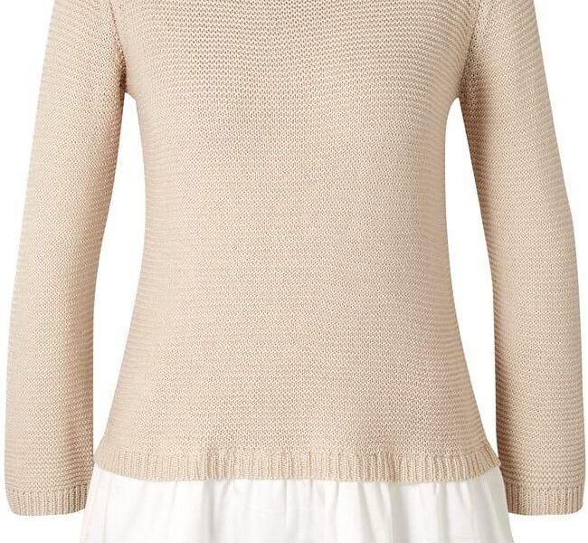 Jeśli lubisz ubrania, które mają dopracowany „look” i sprawiają wrażenie przemyślanej stylizacji, ten model wpisuje się w ten trend dzięki efektowi warstw. W połączeniu z okrągłym dekoltem i czytelną formą rozkloszowaną otrzymujesz sweter, który łatwo włączyć do codziennej rutyny.