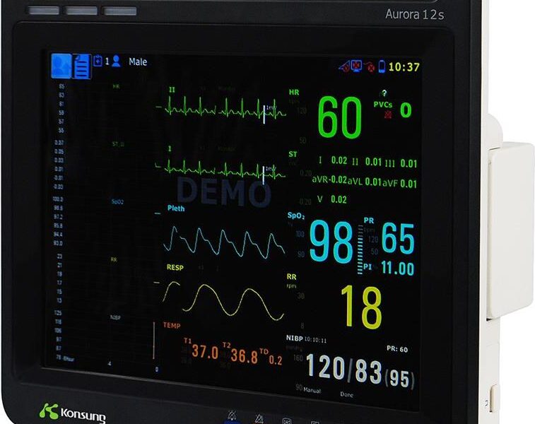 Modułowy kardiomonitor o przekątnej 12 cali z kolorowym wyświetlaczem.Standardowe parametry:EKG, NIBP, SpO2, RESP, TempEkran:Kolorowy wyświetlacz TFT LCD o przekątnej 12,1 cala o wysokiej rozdzielczościOdczyt:Analiza odcinka ST w czasie rzeczywistym, wykrywanie rozrusznika sercaJęzyk polskiZarówno menu jak i instrukcja są w języku polskim. Instrukcja do kardiomonitora jest kolorowa i bardzo czytelna dzięki czemu obsługa będzie prosta do nauczenia się.Szczegóły produktu:Wskaźnik awarii i nieprawidłowo użyciaFunkcja zarządzania wprowadzaniem informacji o pacjencieWieloodprowadzeniowe krzywe EKG są wyświetlane w fazieDuża ilość przechowywanych informacji o trendach tabelarycznych i graficznych i łatwa do przywołaniaPrzechwytywanie dynamicznych przebiegówDo 2,5 godziny pracy wbudowanej baterii litowej wielokrotnego ładowaniaParametry techniczneStandardowa konfiguracjaEkranTyp wyświetlacza 12.1″ kolorowy TFT LCDRozdzielczość 800×600 pikseliPrzebiegi Do 7EKGWejście 3/5 kabel EKGWybór odprowadzeń I II III aVR, aVL, aVF, VWzmocnienie *0.25, *0.5, *1, *1.2Prędkość zapisu 6.25mm/s, 12.5mm/s, 25mm/s, 50mm/sZakres tętna 15-30bpmKalibrowanie ±1mvPrecyzja ±1bpm lub ±1%NIBPMetoda badania OscylometrycznaPrzeznaczanie dla Dorosłych, dzieci i noworodkówTyp pomiaru Skurczowa średnia rozkurczowaParametr pomiaru Automatyczny, ciągły pomiarMetoda pomiaru mmHg lub ±2%SPO2Typ wyświetlacza Przebieg, daneZakres pomiaru 0-100%Precyzja ±3% (pomiędzy 70%-100%)Zakres tętna 20-300bpmPrecyzja ±1bpm lub ±2%Rezolucja 1bpmDwie metody pomiaru temperaturyLiczba kanałów 2 kanałyZakres pomiaru 0-50℃Dokładność ±0.2℃Wyświetlanie T1, T2, TJednostka ºC/ºF do wyboruCykl odświeżania 1s-2sRespiracjaZakres pomiaru 0-150rpmDokładność ±1bm lub ±5%Rezolucja 1rpmKonfiguracja opcjonalna (Płatna)EtCO2 – do podłączeniaTyp pomiaru Strumień bocznyZakres pomiaru 0-10.0%; 0-76mmHgDokładność <5.0%, ±0.28kPa; ±2mmHg>5.0%, ±10%2-IBP (opcjonalne)Zakres pomiaru 10~300mmHgLiczba kanałów 1 lub 2 kanałyDokładność ±1mmHg lub ±2%Etykieta ciśnieniowa ART, CVT, RVP, LAP, RAP, PAP, ICP, LVP