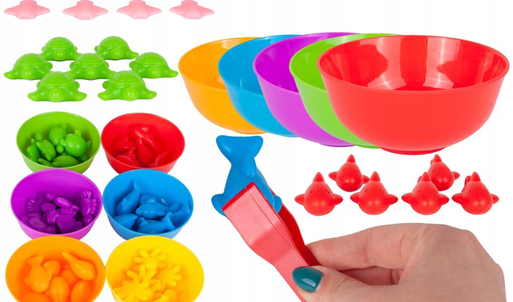 W zestawie dziecko otrzymuje różnorodne morskie zwierzątka, które można sortować i dopasowywać do odpowiednich miseczek. To właśnie ten prosty mechanizm sprawia, że zabawa szybko staje się nauką: maluch liczy elementy, porównuje, a następnie wybiera właściwe miejsce dla każdego zwierzątka. Dzięki temu rozwija zdolności logicznego myślenia oraz umiejętność odpowiedniego dopasowywania.