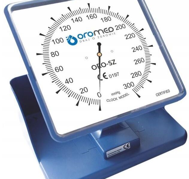 Ciśnieniomierz zegarowy z dużą, czytelną tarczą.Profesjonalny zegarowy aparat do pomiaru ciśnienia tętniczego krwi. Może być montowany na statywie na ścianie lub stawiany na biurku dla zapewnienia wygody użytkowania. Ciśnieniomierz ORO- SZ posiada dużą, czytelną tarczę o wymiarach 200mm x 20mm, dzięki czemu odczytywanie wyników jest szybkie i wygodne.Gwarancja: 2 lata z punktami serwisowymi na terenie całej Polski.Specyfikacja:Zakres pomiarowy: 0-300 mmHgCzytelna tarczaEstetyczne wykonanieWysokiej jakości mankiet dla dorosłychW skład zestawu wchodzą:CiśnieniomierzMankietStatywSpiralny przewód