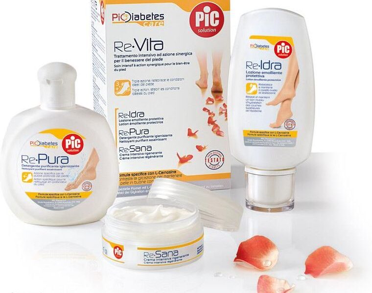Zestaw dla diabetyków do pielęgnacji stóp PiC Solution Re-VitaZestaw trzech kosmetyków z L-karnozyną dla higieny i pielęgnacji stóp: Re-Pura, Re-Idra i Re-Sana.Wyjątkowa formuła z L-karnozyną!Przeciwdziała glikacji, regeneruje skórę i spowalnia procesy starzenia.Zmniejsza ryzyko powstawania owrzodzeń.PiC Solution Re-Pura płyn do higieny stóp, 200 mlOczyszczający i dezynfekujący preparat do stóp.Wyjątkowa formuła z chlorheksydyną i L-karnozyną dla silnie oczyszczającego działania; przeciwdziała proliferacji drobnoustrojów i pozwala utrzymać skórę w dobrym stanie. Zapewnia całkowitą higienę.PiC Solution Re-Idra nawilżający balsam ochronny, 150 mlNawilżający balsam do stóp pozwalający przywrócić i zachować idealny stan skóry stóp.Innowacyjna formuła oparta na L-karnozynie, wzbogacona o glicerynę, poprawia elastyczność skóry oraz jej funkcjonowanie, a także przywraca i utrzymuje właściwy poziom nawilżenia skóry. Zawiera ekstrakt z drzewa herbacianego, rośliny znanej ze swoich naturalnych właściwości antybakteryjnych.PiC Solution Re-Sana krem intensywnie regenerujący, 50 mlIntensywnie regenerujący krem do stóp.Dzięki wyjątkowej formule opartej na L-karnozynie i aloesie regeneruje skórę, a także poprawia elastyczność skóry, zapobiegając jej przesuszaniu i łuszczeniu się. Olejki kokosowe odżywiają i nawilżają skórę, co pozwala utrzymać stopy w idealnym stanie.