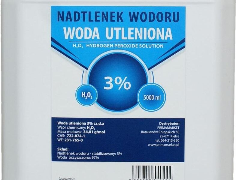 Przedmiotem sprzedaży jestWoda Utleniona 3% Nadtlenek Wodoru cz.d.a.o pojemności: 5L / 5000mlWzór chemiczny: H2O2Masa molowa: 34,01g/molNumer CAS: 722-874-1 / Numer WE: 231-765-0Skład chemiczny:Nadtlenek wodoru- stabilizowany 3%Woda oczyszczona – dejonizowana 97%Data przydatności:12 miesięcy: na opakowaniu ( sprzedajemy towar z bieżącej produkcji)Opakowanie:Kanister UN 5L (Certyfikat UN) trwały, bezpieczny i chemoodporny z HDPE + Nakrętka samoodpowietrzająca