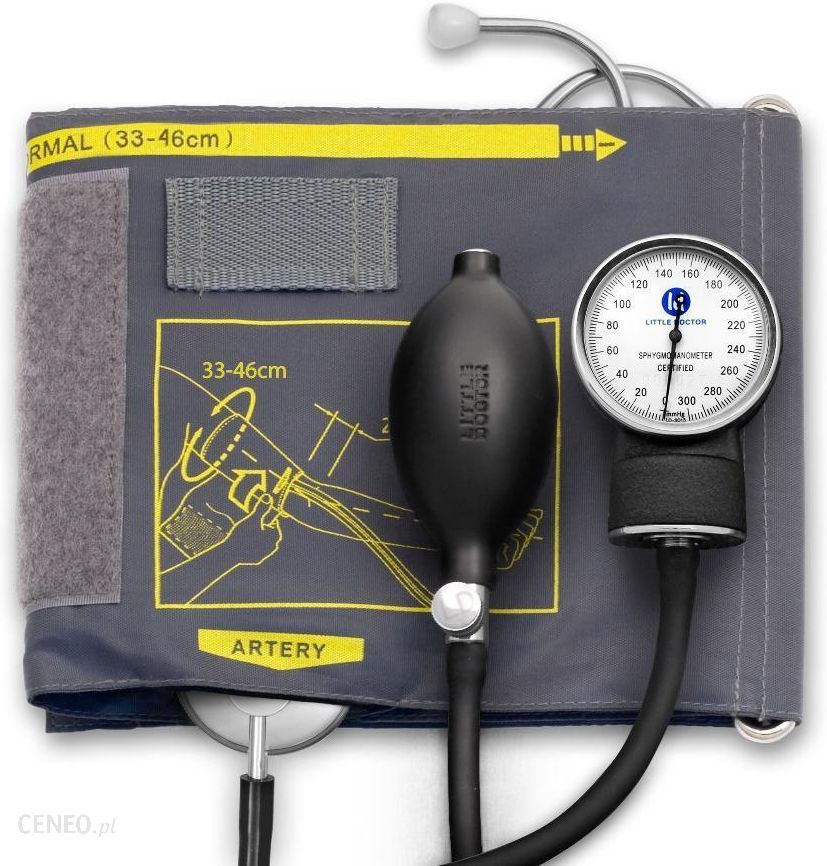 Klasyczny ciśnieniomierz z metalowym manometrem. Metalowy stetoskop wbudowany w mankiet. Ciśnieniomierz dostosowany do potrzeb osób z dużym obwodem ramienia, zawiera w komplecie duży mankiet – 33-46 cm. Mankiet ze specjalnymi oznaczeniami rozmiaru oraz pierścieniem metalowym. Mankiet hipoalergiczny, nie zawiera lateksu.